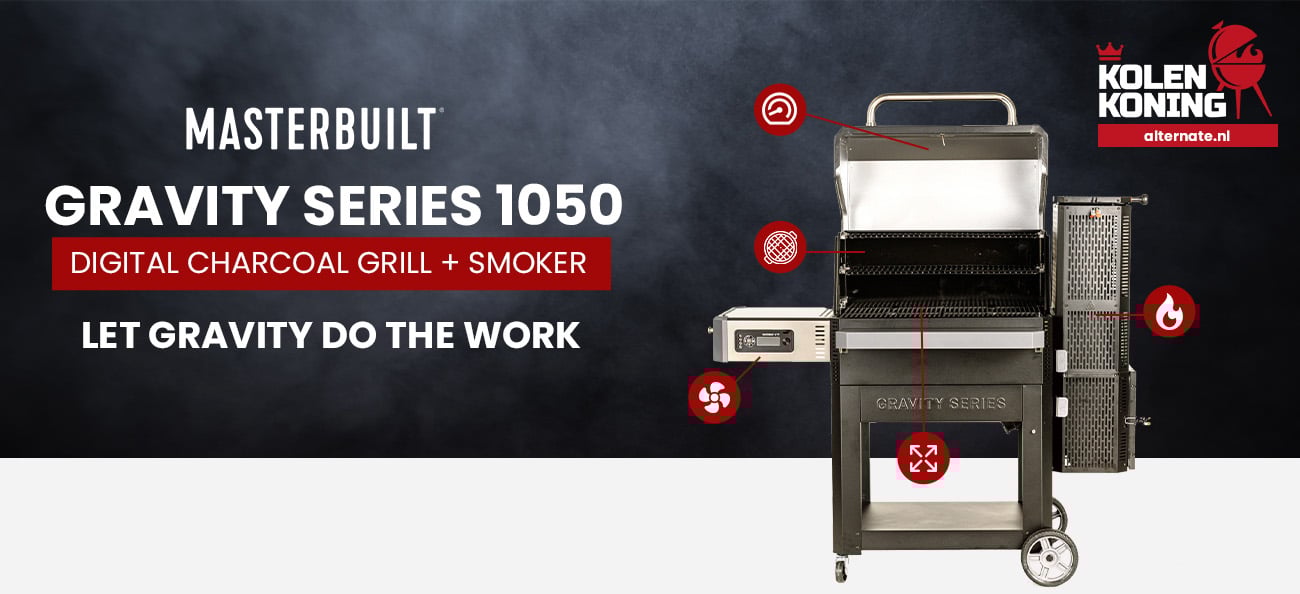 Met de Gravity Series 1050 digitale houtskoolbarbecue en -rookoven van Masterbuilt kun je roken, grillen, schroeien, bakken, braden en nog zo veel meer. Met al deze functies word jij ook eenvoudig een Kolen Koning.